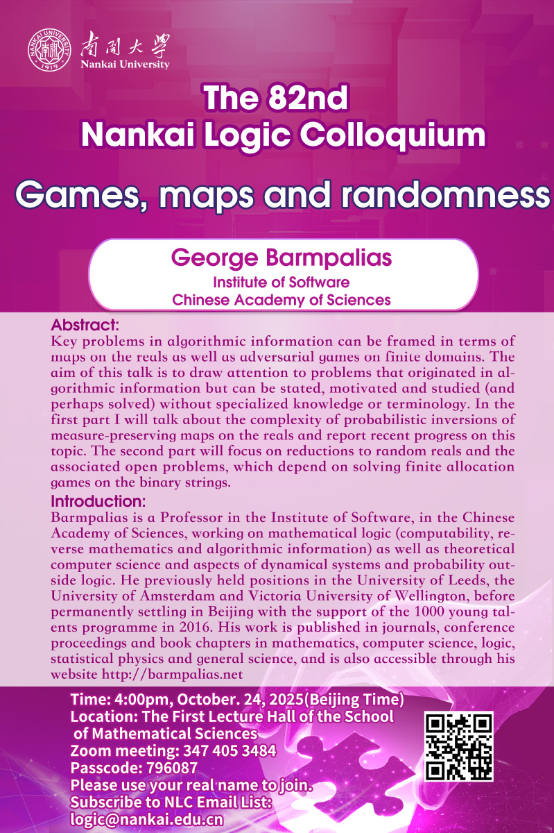 Our speaker is George Barmpalias, from the Institute of Software, CAS. The online meeting is going to be held via Zoom.