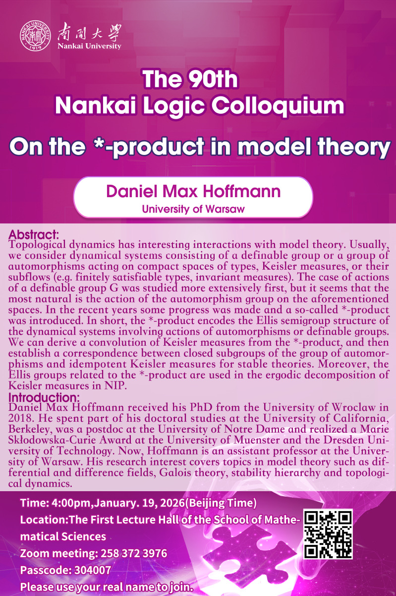 Nankai Logic Colloquium is going to take place on January 19th(Monday), at 4:00 pm (GMT+8, Beijing time), hybrid.