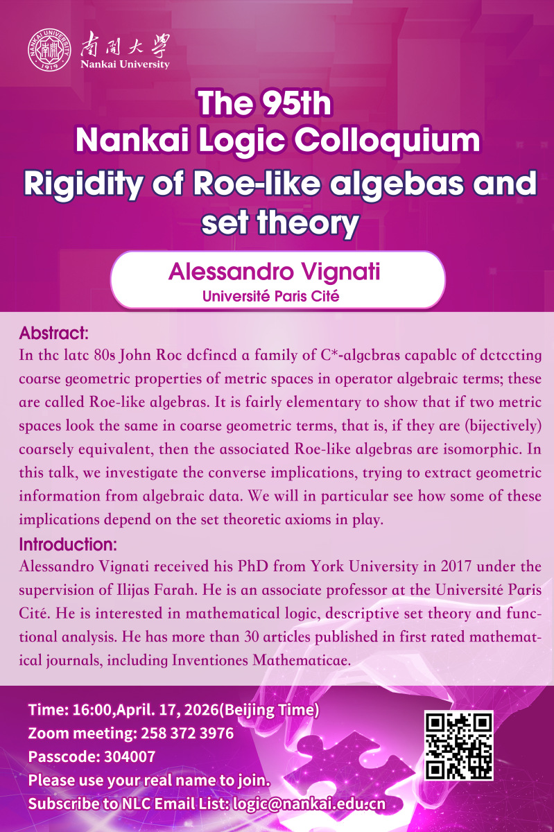 Nankai Logic Colloquium is going to take place on April 17th, at 4:00 pm (GMT+8, Beijing time), online.