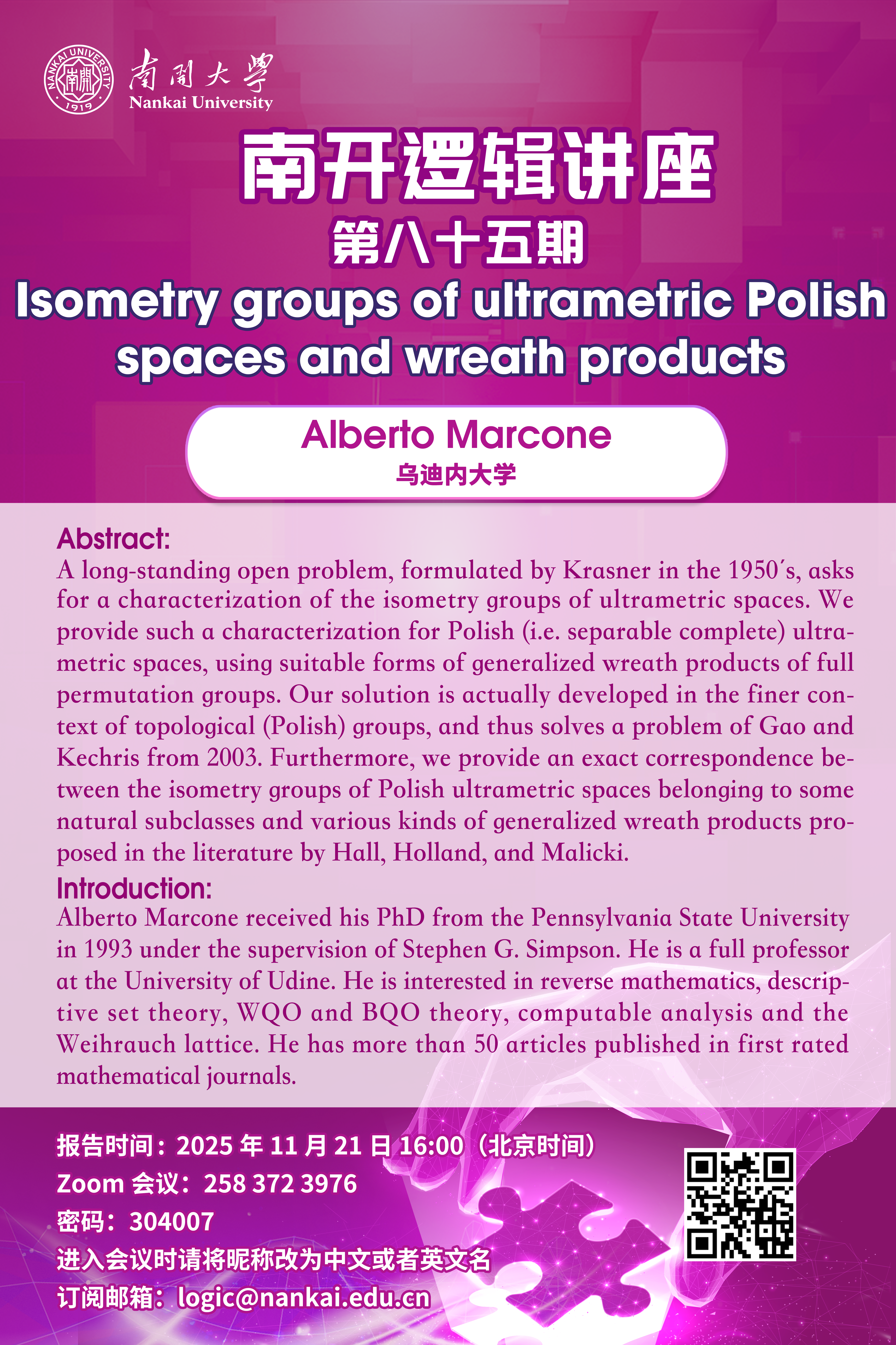 南开逻辑讲座第八十五讲将于北京时间2025年11月21日下午4点举行。本次讲座将由来自乌迪内大学的Alberto Marcone主讲。