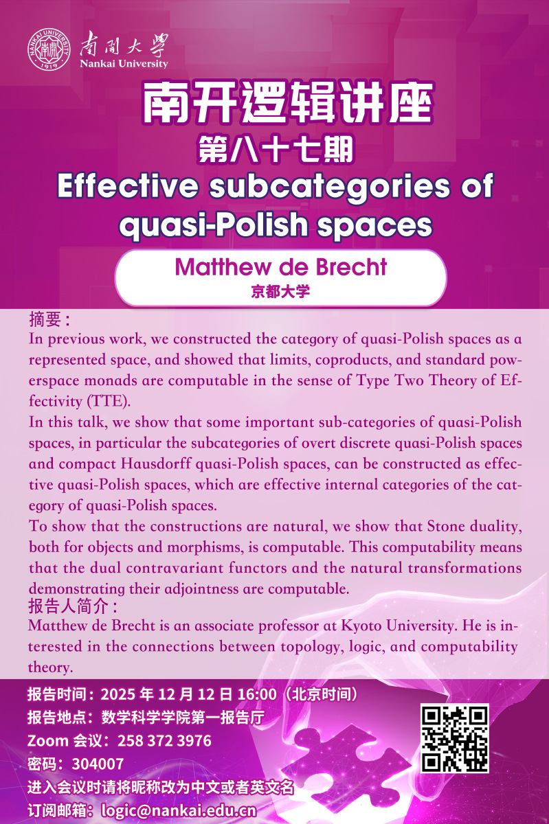 南开逻辑讲座第八十七讲将于北京时间2025年12月12日下午4点举行。本次讲座将由来自京都大学的Matthew de Brecht主讲。