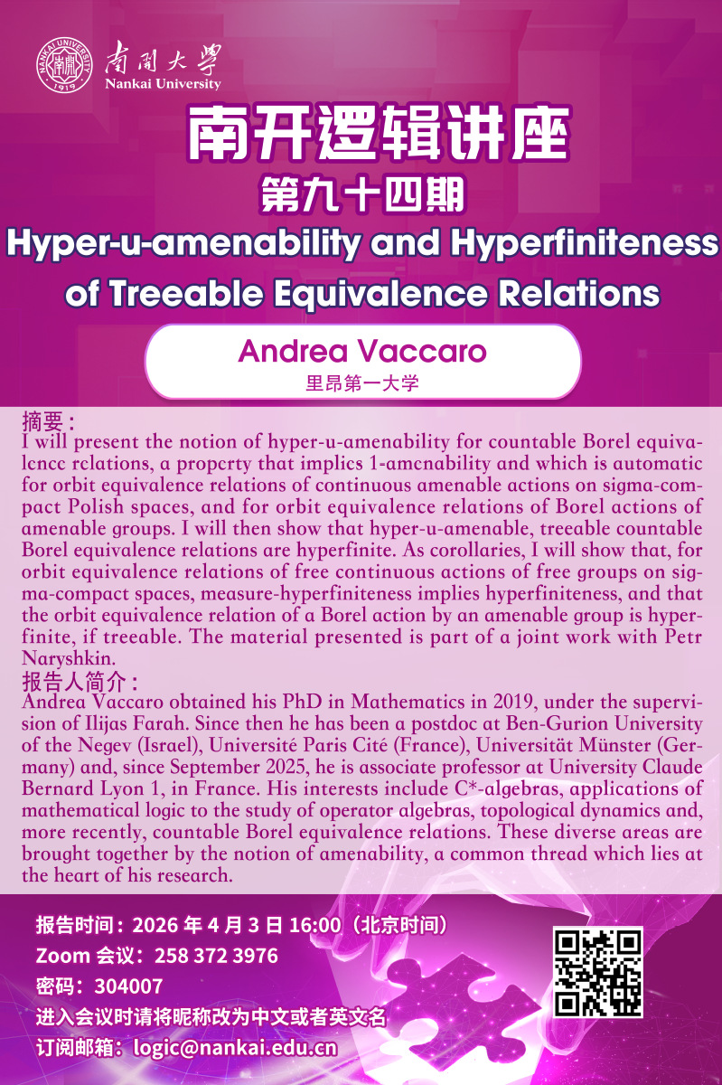 南开逻辑讲座第九十四讲将于北京时间2026年4月3日下午4点举行。本次讲座将由来自里昂第一大学的Andrea Vaccaro主讲。