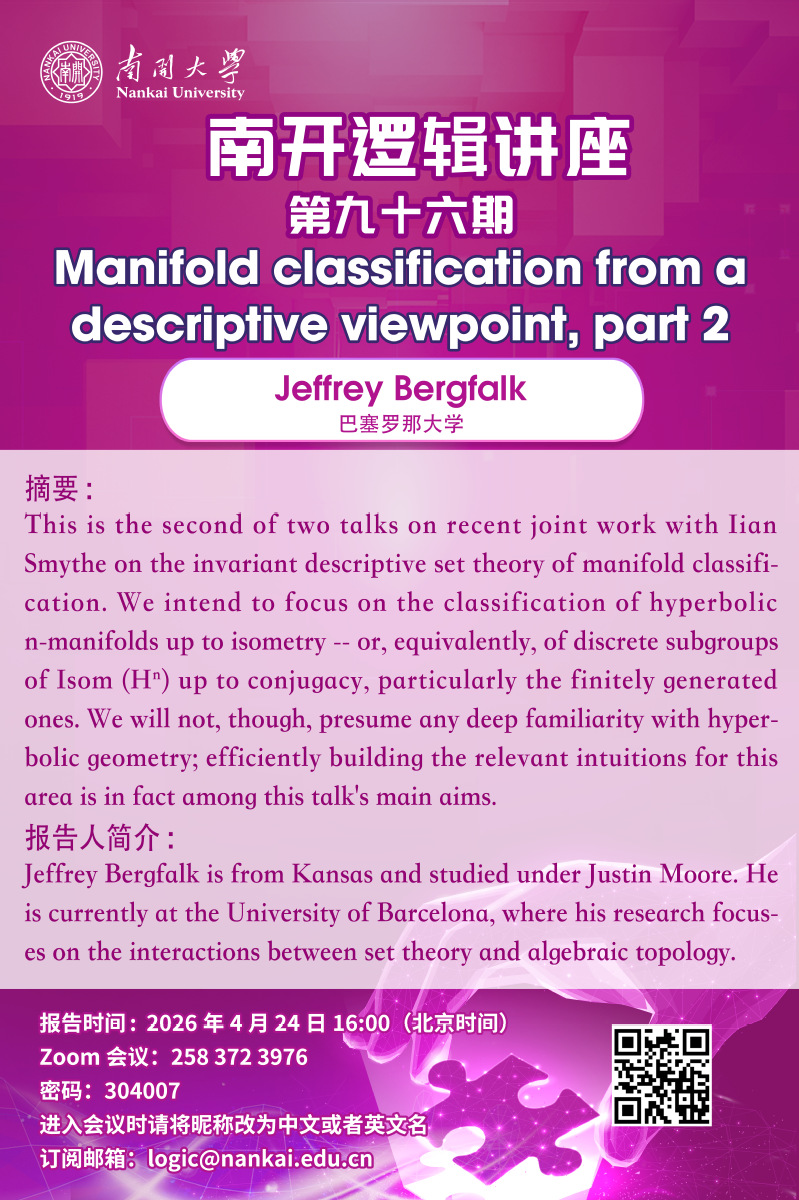 南开逻辑讲座第九十六讲将于北京时间2026年4月24日下午4点举行。本次讲座将由来自巴塞罗那大学的Jeffrey Bergfalk主讲。